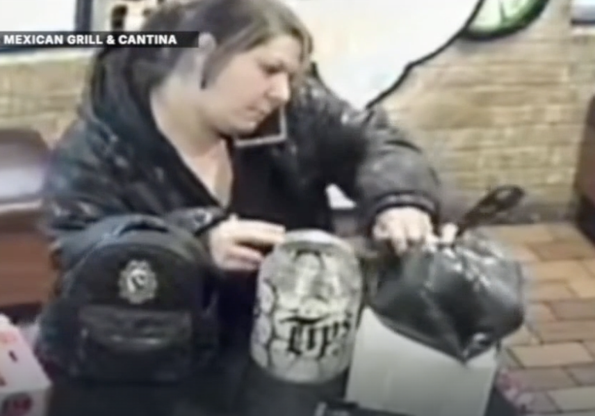 The video shows an employee handing the woman her carryout order at the counter. The woman grabs the order along with the tip jar and walks off.